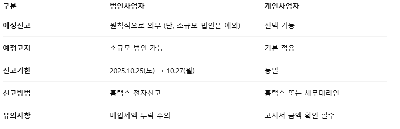 [ 부가가치세 예정신고와 예정고지의 차이, 소규모 법인 예정고지 요건, 2025년 2기 부가세 신고기한까지 정리한 핵심 내용입니다.]